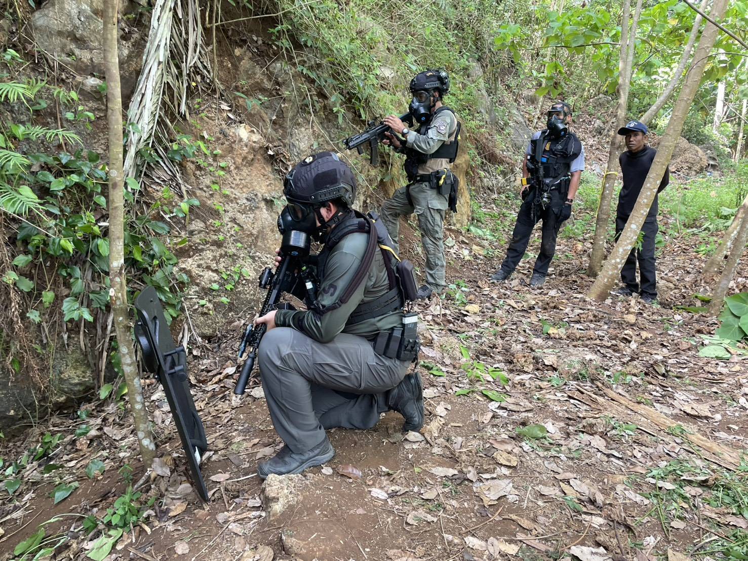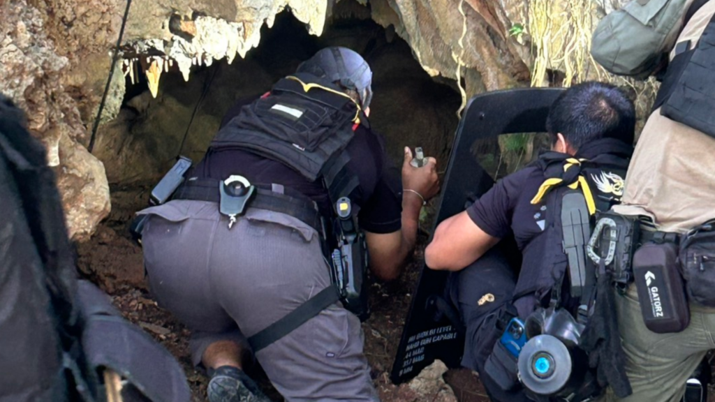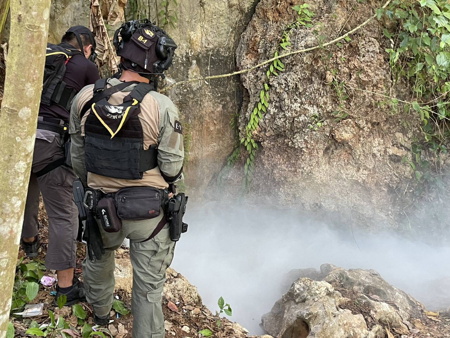 เช้าวันที่ 28 เม.ย. 69 เจ้าหน้าที่ได้ประสานสนับสนุนกำลังจาก ชุดปฏิบัติการพิเศษ “ราชเดช” บก.ภ.จว.ชุมพร ที่มีความพร้อมด้านอาวุธและอุปกรณ์ป้องกัน เข้าตรวจสอบที่เกิดเหตุเนื่องจากผู้ต้องหามีอาวุธปืนและอยู่ในชัยภูมิที่ได้เปรียบ โดยเจ้าหน้าที่ชุดราชเดชได้ทำการโยนระเบิดควัน (แก๊สน้ำตา) เข้าไปภายในถ้ำเพื่อบีบให้ผู้ต้องหาออกมา แต่ไม่มีการตอบโต้